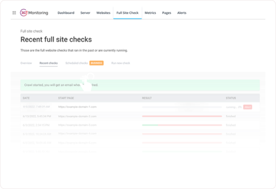 Comprovació completa del lloc protegeix la vostra presència en línia contra errors. Rastreja tot el vostre lloc web o botiga en línia i identifica enllaços morts, imatges trencades, errors de JavaScript i moltes més anomalies, ajudant a evitar problemes del lloc web.